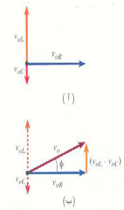 ويمكن جمع المقادير المتذبذبة التي تكون مختلفة في الطور مع بعضها البعض بواسطة رسم هندسي بياني بسيط. ومفتاح فهم هذا الرسم هو في معرفة أن 1/4 دورة تكافئ اختلافاً مقداره 90o في طور كمية تتغير جيبياً مع الزمن . وسنمثل سعة الجهد عبر R وهي v0R بمتجه يتجه نحو ال اليمين في الشكل (3 أ) . ونعلم أن هذا الجهد متفق في الطور مع التيار المار في الدائرة ولذلك فإن هذا الاتجاه هو الذي يمثل التيار أيضاً. ولكي نمثل سعة الجهد v0L عبر L فلابد من رسم متجه يتجه بزاوية 90 بعيداً عن v0R كما الشكل (3 أ). وهذه الزاوية هي التي تناظر اختلافاً في الطور مقداره ربع دورة بين v0R وi0 . اما سعة الجهد v0C عبر المكثف فلابد من رسمها في اتجاه ضد اتجاه .v0L وتتحد مقادير هذه المتجهات من قانون أوم والقوانين المكافئة له.