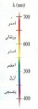 الشكل ((1: التناظر بين الأطوال الموجية والألوان الموضحة هنا تقريبية فقط. والألوان مثل الأزرق المخضر والبرتقالي تحتل مناطق متوسطة.