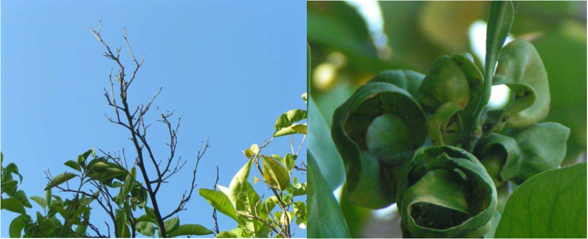شكل يوضح مظاهر الاصابة بمرض التحرن في الموالح الناتج عن العدوى بالاسبيروبلازما