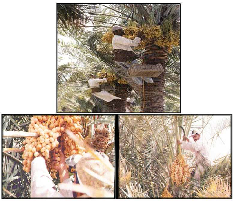 3. هز العزوق ( السباطات ) لتنفصل الثمار الناضجة وتسقط على مفرش من الحصير أو القماش أسف النخلة أو طبق أسف العراجين وتتبع في الأصناف الجافة ونصف الجافة ويعاب عليها زيادة نسبة الفاقد والتالف.