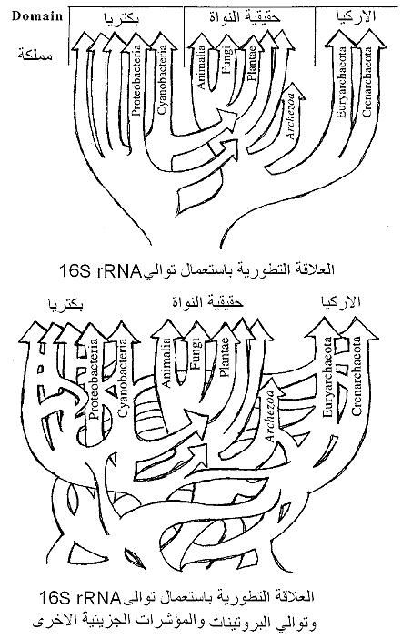 1- الافتقار لبعض العلاقات التطورية بين الاحياء ولعل اكبر الفجوات هي عدم امكانية الربط بين تطور الاحياء حقيقية النواة من بدائية النواة. ومحاولة وضع شجرة الحياة تكاد تكون مهمة صعبة ومتغيرة، فوضع مثل هذه العلاقة التطورية يختلف من وقت لآخر وتزداد الاختلافات وعدم الوضوح كلما تطورت التقنيات والوسائل الدراسية وكما يتضح من الشكل التالي (شكل 1) الذي يوضح العلاقة بين أفرع الحياة والفرق في تشعباتها اثناء عقد من الزمن (1991 – 1999).