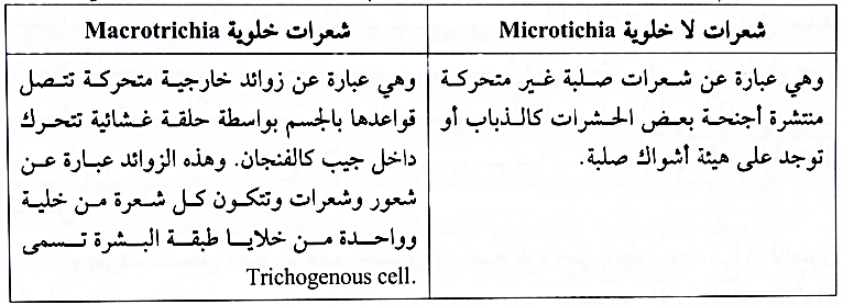 أ- الشعرات Setae وهي تنشا من خلية واحدة وتأخذ عدة اشكال منها: