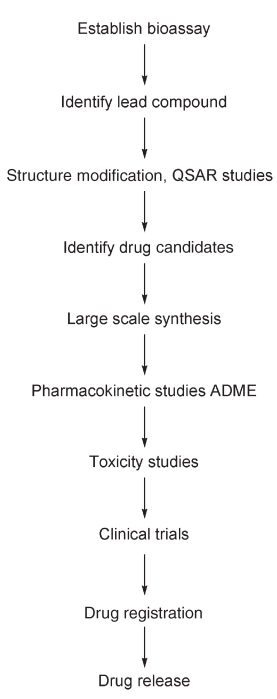Synthetic organic chemistry is one of the corner stones of medicinal chemistry. There are a number of criteria by which a synthesis may be evaluated in a medicinal chemistry context. A convergent synthesis rather than a linear synthesis (Scheme 3) has significant advantages. Not only are there benefits in terms of yield but there is increased flexibility. Structural variation is possible in one arm of the synthesis while keeping the other constant and vice versa. This enables structure: activity studies to be made more easily. Metabolic studies require the preparation of labelled material. It is necessary to explore not only what happens to the intact drug in the body but also to trace metabolic fragments. A convergent synthesis makes labelling different parts of the molecule easier. If a chiral centre is created in the drug then the synthesis should not only be stereospecific but also enantiospecific. The targets for most drugs are chiral. Although the required biological activity may reside in one enantiomer, the other enantiomer may have different, potentially toxic properties. A racemic mixture has to be avoided. Biotransformations involving a chiral enzymatic step have an increasingly important role to play in the preparation of a single enantiomer. While retrosynthetic analysis must play an important role in the design of a synthetic scheme, economic considerations in terms of the availability of starting materials play an equal part. The art of synthesis in a medicinal chemistry context lies in the combination of retrosynthetic analysis with the identification of readily available basic building blocks in the target structure. The dissection of a structure into its basic building blocks can also be a useful way of remembering the structure of drugs.