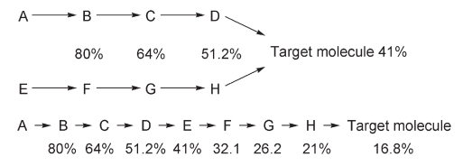 Scheme 2 The effect of an 80% yield at each step on a convergent and a linear synthesis