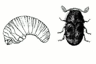 الحشرة البالغة صغيرة الحجم 2-2.5 ملم لونها قاتم تميل الى اللون الأسود اجنحتها الغمدية مخططة ومغطاة بزغب صغير رمادي اللون، قرون الاستشعار مرفقية ورقية حيث تنتهي بمروحة مؤلفة من ثلاث وريقات.