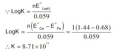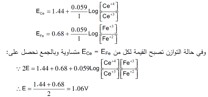 عند معايرة 100 مل من محلول الحديدوز Fe+2 (0.1 N) مع محلول السيريوم الرباعي ( Ce+4 (0.1 N في وجود حمض الكبريتيك (1N) H2SO4 ثابت الاتزان لهذا التفاعل: