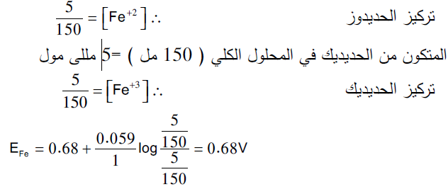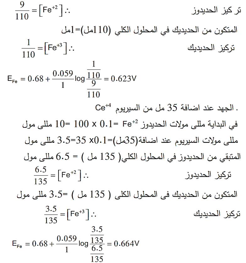 الجهد عند إضافة 85 مل من السيريوم Ce+4 في البداية مللى مولات الحديدوز Fe+2 = 100 x 0.1= 10 مللي مول مللى مولات السيريوم عند اضافة (85 مل) = 85 x 0.1= 8.5 مللي مول المتبقي من الحديدوز في المحلول الكلي ( 185مل )= 8.5 مللي مول