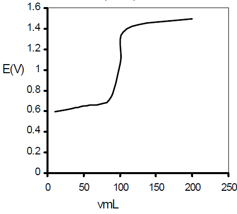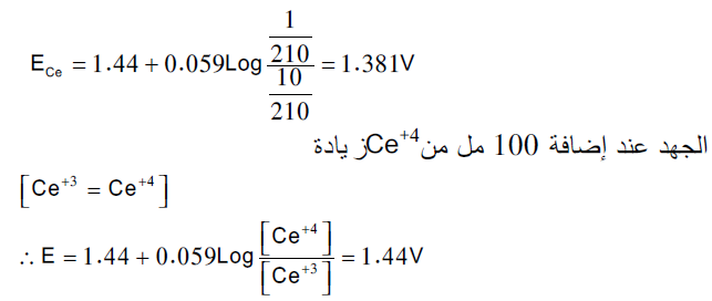 الجهد عند نقطة التكافؤ أي إضافة ( 100 مل) من محلول السيريوم الرباعي Ce+4