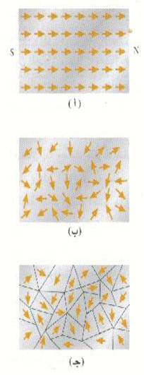 وتكون المغناطيسات الذرية لمعظم المواد ـ إذا وجدت ــ متجه عشوائياً كما في الشكل (2 ب). إلا ان المواد الفيرومغناطيسية تتكون عادة من مناطق صغيرة تكون الذرات في كل منها مصفوفة في اتجاه واحد. ويسمى كل من هذه المناطق المرتبة نطاقاً ( الشكل (2)). وتحتوي قطعة الحديد العادية على نطاقات بكل منها نحو1016 ذرة. ومعنى هذا أن الأبعاد الخطية للنطاق ليست سوى كسر صغير من المليمتر. على أن النطاقات في قطعة حديد غير ممغنطة تأخذ اتجاهات عشوائية كما في الشكل (3 أ). وعند مغنطة قضيب من الحديد فإن على النطاقات بداخله أن تصطف في صفوف.