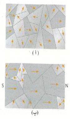 سنفترض أننا بدأنا بقضيب من الحديد وكان غير ممغنط كما يوضح الشكل (3 أ) وكما نعلم فإن للملف اللولبي الذي يحمل تياراً مجال مغناطيسي يتخلل لفاته. والآن ، ينضع القضيب الحديدي في الملف اللولبي ، حيث تتعرض النطاقات لقوى من جانب المجال المغناطيسي للملف. وستنمو تلك النطاقات التي تتخذ اتجاه المجال ، بينما يتقلص حجم تلك التي تتخذ اتجاهات اخرى. والنتيجة النهائية لهذه العملية هي جعل النطاقات تصطف موازية للمجال كما هو موضح في الجزء (ب).