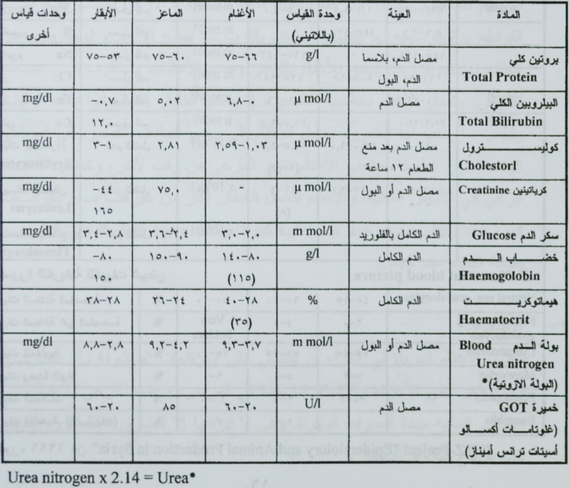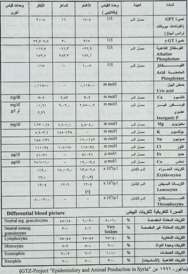 جدول يبين القيم النظامية لبعض مكونات الدم في الأغنام وبعض الحيوانات الاخرى