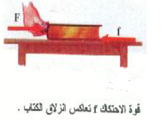 حاول إجراء التجربة الموضحة بالشكل 1)). ادفع كتابا معينا دفعاً خفيفاً بقوة أفقية ؛ لن يتحرك الكتاب. ونظراً لأن الكتاب بظل ساكناً نستنتج أن Fnet= 0. وعليه فلا بد أن توجد على الأقل قوة واحدة مؤثرة في عكس اتجاه القوة التي تؤثر أنت بها على الكتاب. هذه القوة المضادة توفرها المنضدة حيث تتلامس مع الكتاب، وهي القوة f في الشكل. وسنسميها قوة الاحتكاك الاستاتيكي. ومن الواضح أن قوة الاحتكاك الاستاتيكي تتميز بالخواص الآتية: إنها تعاكس محاولة انزلاق الجسم واتجاهها مواز لسطحي التلامس.