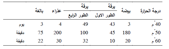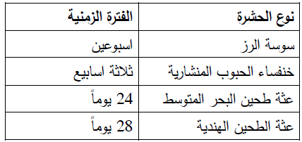 وعموما فان درجة الحرارة 60 °م لمدة ساعة موصى بها لمكافحة كل اطوار وأنواع حشرات المواد المخزونة.