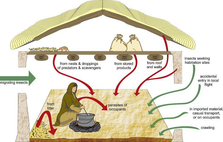 وتوفر الحبوب والاغذية المخزونة هذه المتطلبات لحشرات المخازن بنسب مختلفة تفي بحاجتها ومع توفر هذه المواد فان عدداً قليلاً يقدر بـ 750 نوع قد تكيف للمعيشة في المخازن من اصل اعداد الحشرات المكتشفة البالغة اكثر من مليون ونصف نوع حشري.