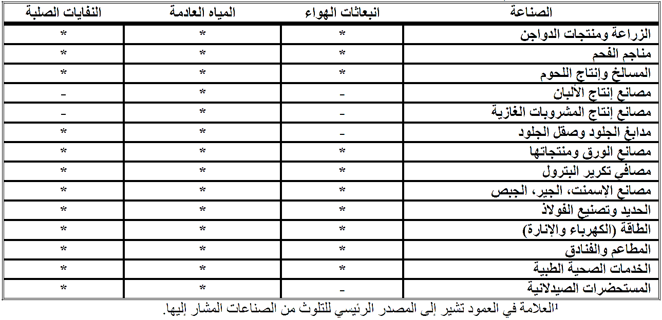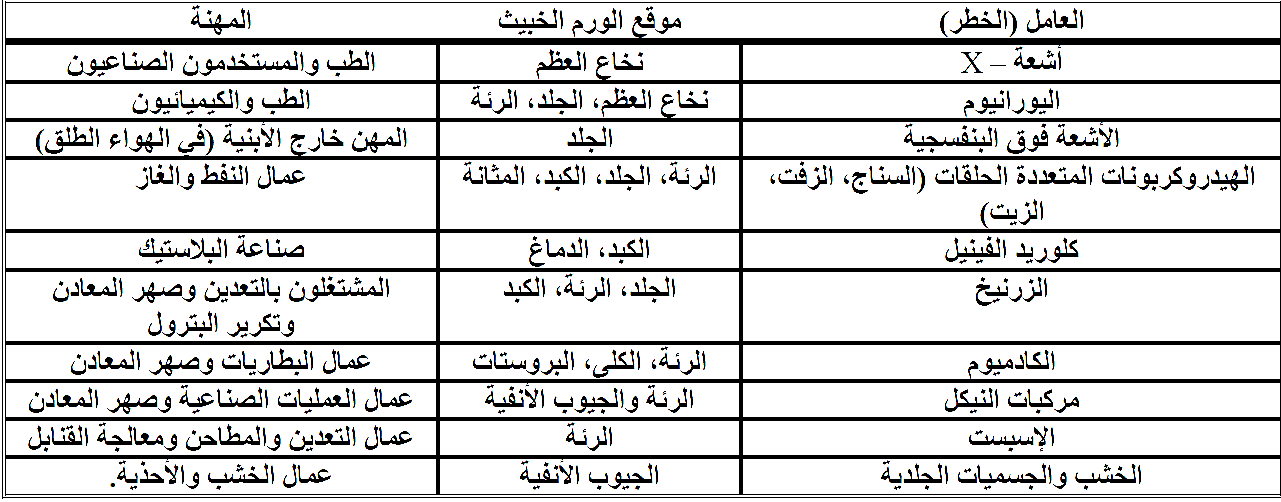 في بعض الحالات دخول المواد الكيميائية المرتبطة بالأمراض بشكل كبير في عمليات التركيب المهنية. وكأمثلة على الأخطار المهنية الهامة والتي يسلط عليها الضوء وارتباطها بالسرطانات يبينها الجدول الاول، بينما تم إدراج النشاطات الصناعية الكبيرة ومصادرها المحتملة لتلوث البيئة في الجدول الثاني.
