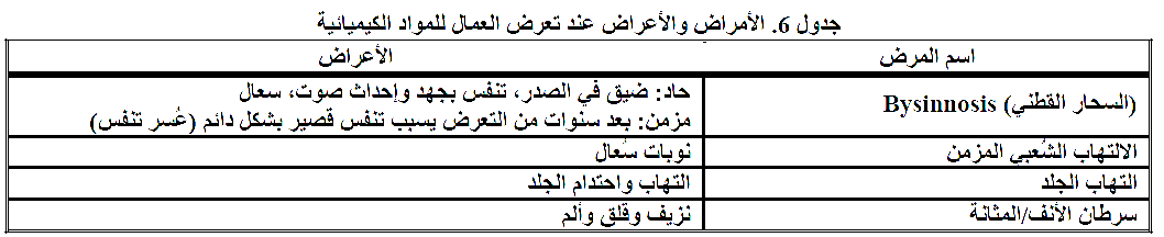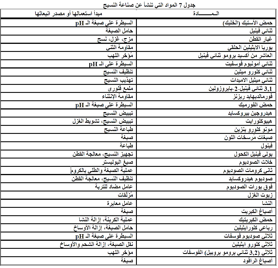 أما المواد التي يتعرض لها العاملون في صناعة النسيج فهي مدرجة بالجدول رقم ( 7). هذه التعرضات قد تكون متزامنة مع الأخطار الفيزيائية التي تشمل الضوضاء والذبذبات والحرارة.