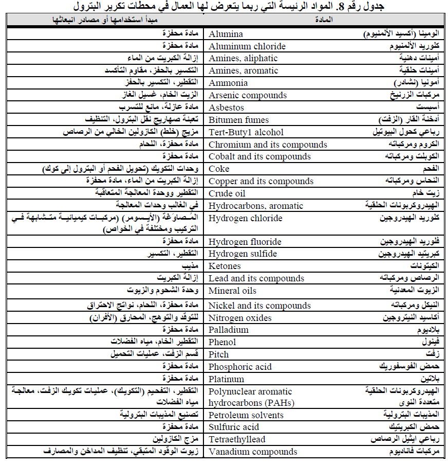 كذلك توجد أخطار صحية مهنية محتملة في مصافي البترول. منها التعرض الناتج عن ملامسة الجلد واستنشاق الغازات والأبخرة، وبشكل رئيسي الهيدروكربونات والتي إما أن تكون موجودة طبيعياً في الزيت الخام والتي تنبعث خلال عمليات التكرير أو يتم تشكلها وتنبعث خلال عملية المعالجة. آما أن مركبات الكبريت الغازية مثل كبريتيد الهيدروجين، ثاني أكسيد الكبريت والمِرْكابتانات التي تنبعث خلال عملية إزالة ومعالجة الكبريت. بالإضافة إلى التعرض للغبار والرذاذ الناتج عن عمليات الصيانة واستخدام المواد المحفزة وحمل المنتجات اللزجة والصلبة مثل الفحم والقار وهذه تعتبر من الأخطار المهنية المحتملة في مصافي البترول. والمواد الرئيسة . التي قد يتعرض لها العاملون في مصفاة البترول مدرجة بالجدول رقم ( 8) وقد بينت الوكالة الدولية لبحوث السرطان أن التعرض المهني لعمليات تكرير البترول من العوامل المسرطنة للإنسان