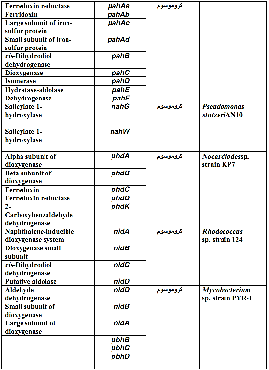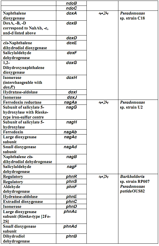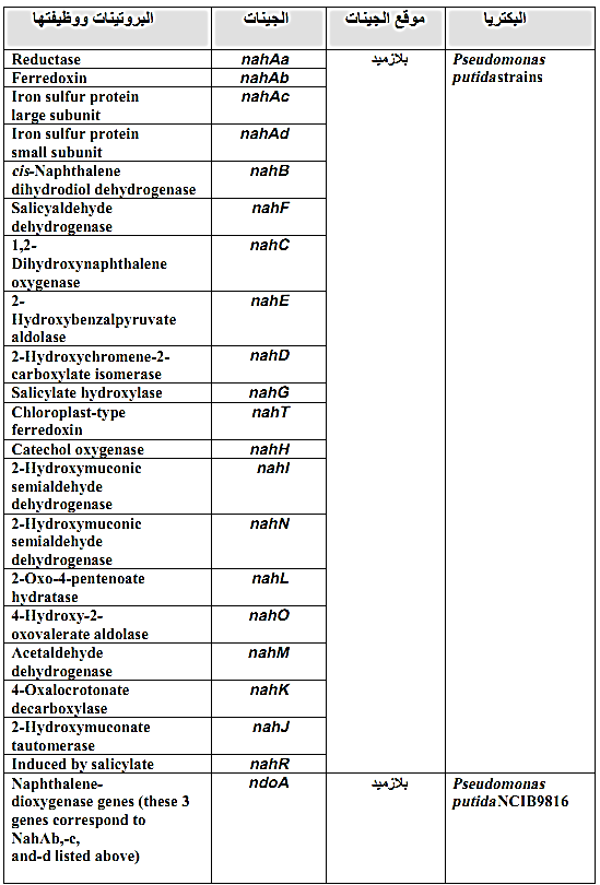 والانزيم Naphthalene dioxygenase واسع الانتشار يمكن ان يساعد في تفكيك عددا اخر من المركبات الحلقية مثل Phenathrene و Anthracene. وتوجد بلازميدات اخرى مثل pah , dox , ndo منتشرة في البكتريا التي تتعايش مع النفط ومركباته، اضافة الى وجود جينات كروموسومية تساعد في فعاليات التفكيك ومنها المذكورة في الجدول (1).