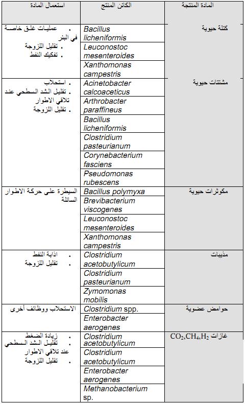 جدول 1 : المنتجات الميكروبية المختلفة المستعملة في استخلاص واسترجاع النفط