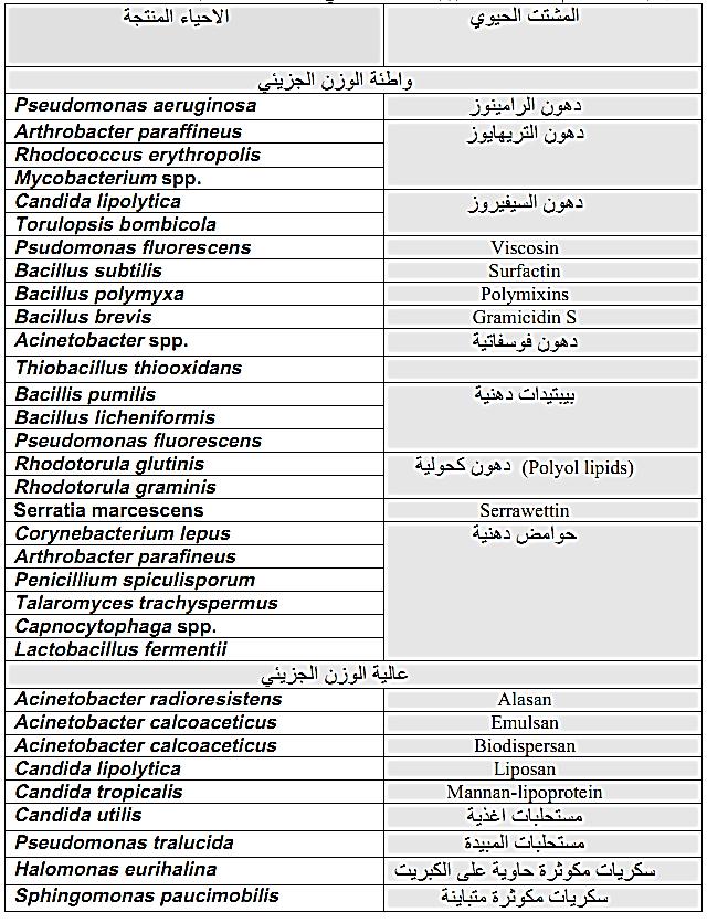 وأهم المستحلبات او المشتتات الحيوية التي تنتجها الاحياء المستعملة في مجالات الصناعات النفطية موضح بعضها في الجدول (2)