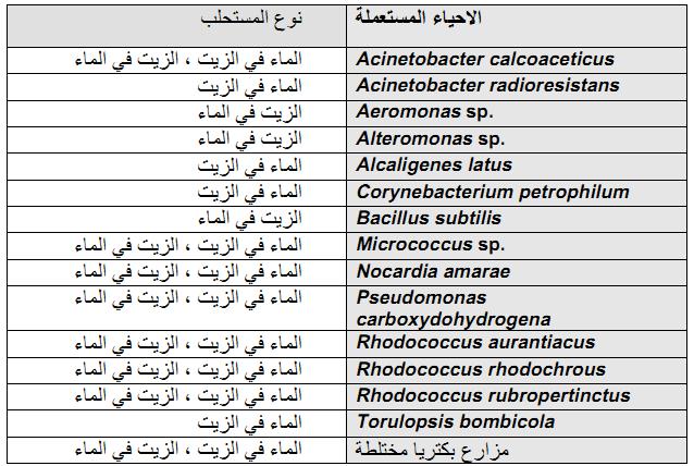 جدول 1 : الاحياء المزيلة لاستحلاب النفط