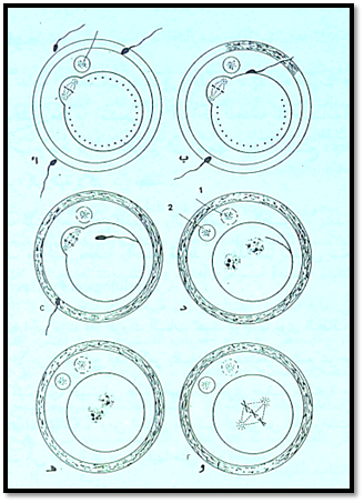 الشكل (1): تمثيل للمراحل المتتالية لعملية اختراق النطفة للبيضة ، كما لوحظت عند احد انواع القوارض