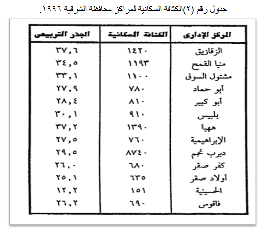 3- استخراج الجذر التربيعي للكثافة السكانية لكل مركز من المراكز الإدارية ، انظر الجدول رقم (2) والذي يوضح الكثافة السكانية لمراكز محافظة الشرقية.