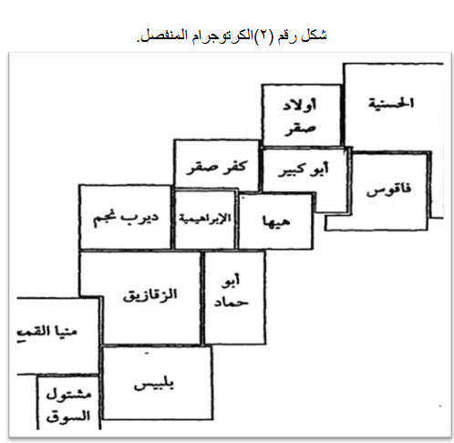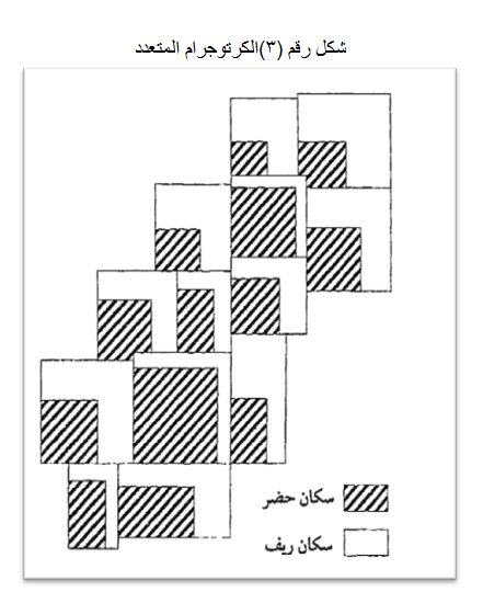 ولا تختلف طريقة حساب الكرتوجرام المتعدد عن حسابات الكرتوجرام المتصل في أي خطوة من خطواتها ، ولكن ينبغي الوضع في الاعتبار ان يكون مقياس رسم الكرتوجرام المستخدم في تمثيل الظاهرتين مقياساً موحداً، كما ينبغي ان تحدد زاوية التقاء الظاهرتين وكما هو موضحة بالشكل الذي يوضح توزيع سكان الحضر والريف في محافظة الشرقية بالزاوية الجنوبية الغربية. انظر الشكل رقم (3).