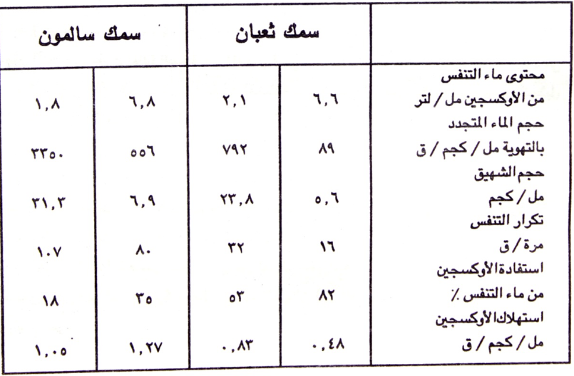 نتائج تنفس سمك الثعبان وسمك السالمون وزن 400 جم على درجة حرارة 17 م للثعبان و15 م للسالمون:
