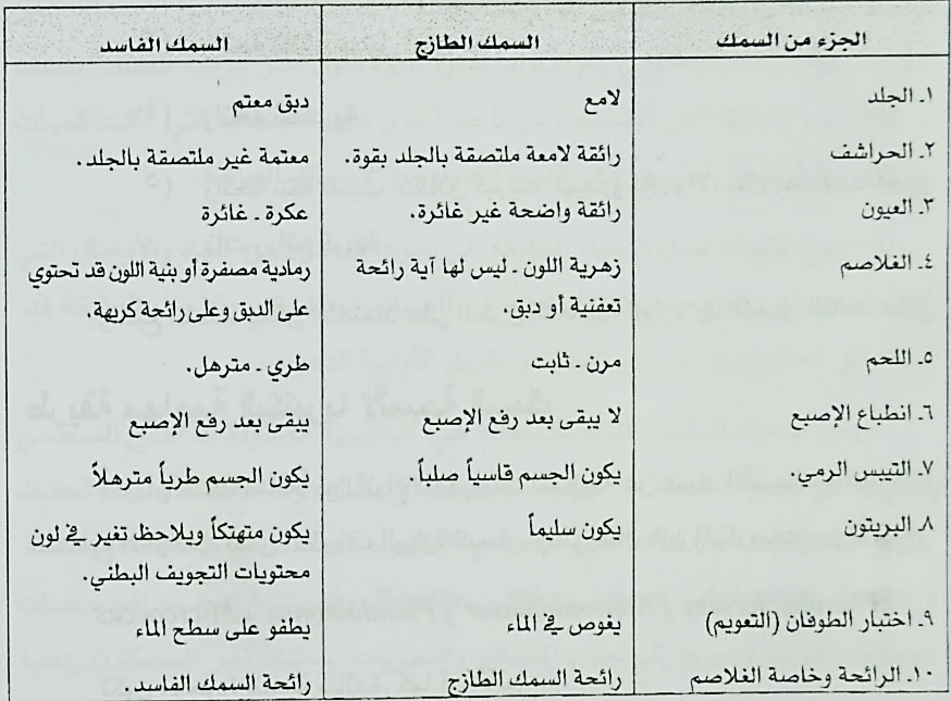 2- السمك الطازج يكون جسمه متماسك ومرنا. الجلد متماسك بالجسم واللحم متماسك بالعظم؟ وعلى ذلك فان السمك التالف او الذي بدا الفساد يعتريه يكون اللحم فيه طريا ومهترئا وناعم الملمس ويفصل عن العظام بسهولة تاركا الوانا تشبه الى حد ما لون صدا الحديد. وفي حال تقدم الفساد يصبح جسم السمكة منتفخا.