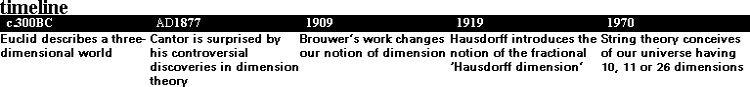 The n dimensions of mathematical space were introduced quite painlessly, while physicists have based theories on space–time (of dimension four) and recent versions of string theory which demand, 10, 11 and 26 dimensions. There have been forays into fractional dimensions with fractal shapes with several different measures being studied. Hilbert introduced an infinite-dimensional mathematical space that is now a basic framework for pure mathematicians. Dimension is so much more than the one, two, three of Euclidean geometry.