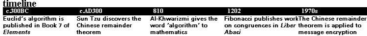 Let’s look at another problem: Angus does not know how many bottles of wine he has but, when he pairs them up, there is 1 left over. When he puts them in rows of five in his wine rack there are 3 left over. How many bottles does he have? We know that on division by 2 we get remainder 1 and on division by 5 we get remainder 3. The first condition allows us to rule out all the even numbers. Running along the odd numbers we quickly find that 13 fits the bill (we can safely assume Angus has more than 3 bottles, a number which also satisfies the conditions). But there are other numbers which would also be correct – in fact a whole sequence starting 13, 23, 33, 43, 53, 63, 73, 83, . . .