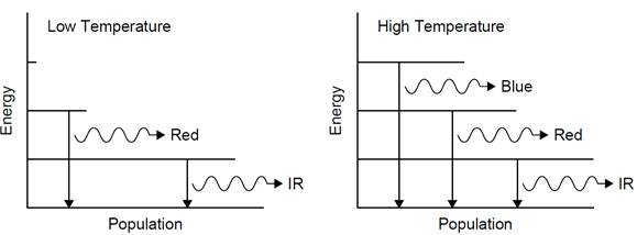have a higher blue content, and at lower temperatures the emission is seen as red. Examining the energy levels in this situation (as in Figure 1.1), we see that at low temperatures only low energy levels will be excited. The atoms in this case will have enough energy to cause transitions creating a reasonable amount of infrared light and some red light, but very few atoms will have enough energy to allow the production of blue light. As the temperature of the object is increased, higher atomic levels will be excited and blue emissions will be seen. This shift is due to the fact that blue light is literally more energetic than red light, as evident from the Planck relationship E = hv. It may also occur to the reader that blackbody radiation is broadband. Unlike line spectra produced by most gas discharges, thermal light tends to occur in the form of a continuum of wavelengths spanning a large range. The answer is in the spacing of energy levels in the emitting substance. Gases usually have well-defined discrete wavelengths, due to the fact that each atom in the gas is ultimately identical and completely independent (i.e., no interactions between the atoms in the gas lead to changes in the discrete atomic energy levels). In solids, atoms are closely packed and interact with each other, which serves either to widen energy levels to the point where they overlap or create new electron energy levels. This leads us to speak instead of the energy levels in solids as energy bands. In some cases these bands are simply a discrete level that has been broadened (i.e., spans a range of possible energies) through various mechanisms. If the discrete energy levels in Figure 1.1 were replaced by wide bands of possible energies, it is easy to see that the average light emitted will be broadband.