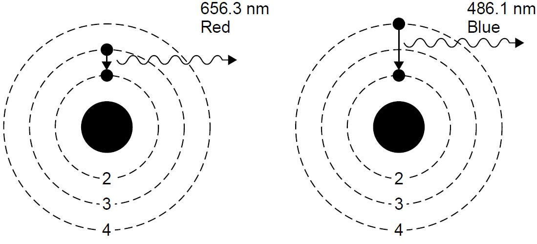 Recall that the emission spectrum of hydrogen consists of discrete lines, each of which can now be explained as corresponding with a jump or transition in the energy states of the atom (a change in orbit, if you will). In the case of the Balmer series, each line corresponds to an energy-level change which results in the final energy state being n = 2 (the second orbit). Higher-energy photons result from larger jumps, such as the violet line, which results from transitions from very high orbital states to the final n = 2 state. The red line has relatively little energy; it results from a relatively small jump between the n = 3 and n = 2 orbital states. The five visible lines of hydrogen may now be seen as a jump between a higher energy state with n = 3, 4, 5, 6, or 7 and a lower-energy state with n = 2. Mathematically, this can be determined by calculating the energy for each Bohr orbit and then the energy lost in a downward quantum jump. For example, consider the transition from n = 3 to n = 2 as depicted in Figure 1.2. The energy associated with each orbit is calculated to be -21.511 and -23.400 eV, respectively. When the transition occurs, the energy of the liberated photon will be equal to the difference in energy between these two levels, or 1.889 eV. This corresponds to a photon at a wavelength of 656.3 nm in the red. Applying the same calculation to the n = 4 to n = 2 transition yields a photon of 486.1 nm. In the latter case the jump is larger, so the energy lost to the photon is also larger. Transitions between energy levels do not have to end at n = 2 but can end at almost any level, such as n = 1 (the first orbit). These transitions have very high energies, being so close to the nucleus (from kinematics we know that low orbits close to the