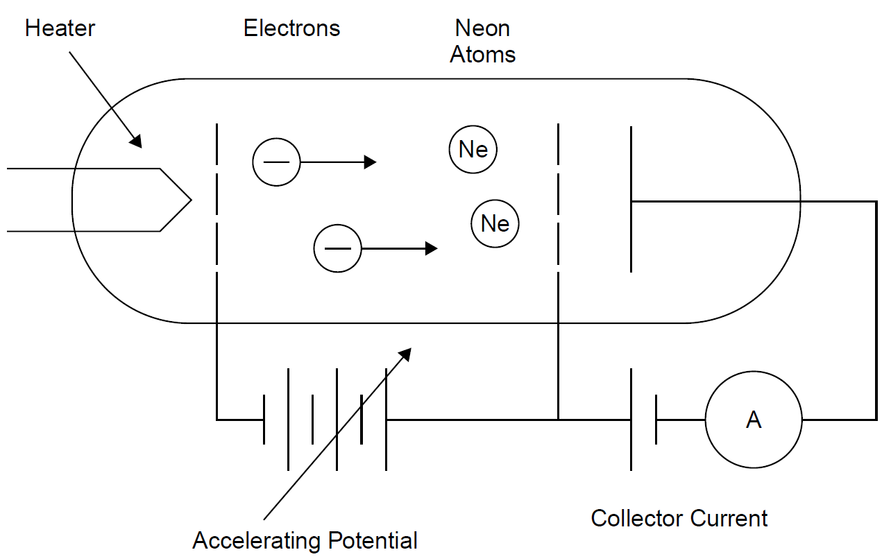 through the gas unimpeded, being manifested as current through the tube (i.e., electron flow). At 18.7 eV the electrons have enough energy to excite neon atoms to their first excited level upon impact. From basic kinematics we see this as the inelastic collision of the lightweight, excited electron with the more massive neon atom. The result of the collision is that the energy of the electron is totally absorbed by the much heavier atom, pushing the neon atom’s energy to the first excited state. The surprising part is that the energy of the neon atom is quantized it can only take on certain allowed values. Electrons whose energy is below 18.7 eV cannot transfer energy to the neon atom to excite it. The corresponding drop in current occurs because electrons at that energy are no longer flowing though the tube to the anode (i.e., current flow) but rather, are transferring their energy to neon atoms (where they show up as emitted light). It is evident from Figure 1.2 that when the accelerating voltage is ramped from zero to 70 V, three dips in current occur. Electrons emitted from the heater (filament) travel down the tube and acquire energy. Until they reach 18.7 eV, they cannot transfer energy to the abundant neon atoms and so travel unimpeded. When the electrons have 18.7 eV of energy, a good number of them will collide with neon atoms and transfer energy to them. These neon atoms will acquire the energy but will eventually lose it by emitting a photon and returning to ground level (this is actually a two-step process in neon). Electrons, now depleted in energy by the collision, will continue down the tube acquiring more energy until they again reach 18.7 eV, at which point they can again collide with neon atoms and transfer energy to them. The process continues until the electrons reach the anode. With a 70-V accelerating potential, we would expect three dips as well as three corresponding areas in the tube where neon atoms emit light, as shown in Figure 1.3(b). In Figure 1.3, electrons in the dark space just above the lower grid are accelerating upward away from that grid toward the top of the tube. They lack sufficient energy to excite neon’s energy levels and so retain their energy as they travel down the tube. Eventually, moving upward as they acquired energy, they possess enough energy to excite neon’s first energy level, so collisions with neon atoms will result in energy transfer. Excited neon atoms emit light (the lowest band of orange light between the grids in the photo) and in doing so lose energy. Still moving upward, we see a lack of light emission as low-energy electrons travel through, acquiring more energy due to the applied potential. By the time the electrons reach the area of the second band of light, they have again acquired the necessary energy to excite neon’s first level, so light emission occurs again as electrons transfer their energy to neon atoms in this region. In Figure 1.3(b) the process repeats again, with electrons acquiring energy a third time to transfer to neon atoms by collisions (the third band of light), until they finally reach the top grid and stop accelerating. The Franck Hertz experiment demonstrates that atoms do indeed have quantized, discrete energy levels. These levels define the excitation of the atom. An atom that is not excited (and hence is in its lowest-energy configuration) is said to be at ground state. As energy is absorbed by the atom, it is elevated to higher-energy states. In the case of neon, the first excited state is observed to be at about 18.7 eV4. For hydrogen, the first excited state is observed to be at 3.4 eV above ground state.