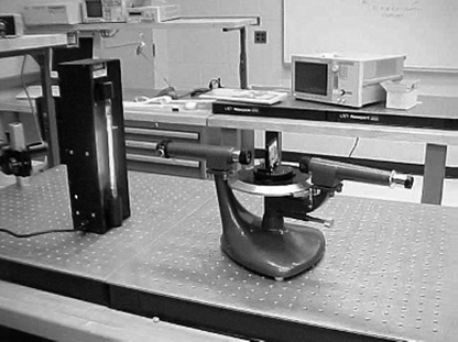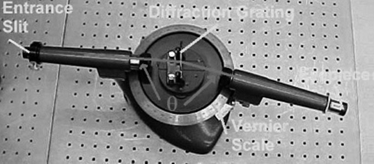 where u is the angle at which the light is diffracted, m the order of the emission (assume that m =1 here), and d the spacing between lines on the grating in meters. Consider a simple spectroscope as in Figure 1.1, used to analyze spectra emitted by a gas discharge tube. Incident light passes through a small slit and is focused by a small telescope (on the left side of the unit), falling onto the diffraction grating, which separates the components. An eyepiece on another small telescope is rotated around the grating until a particular spectral component is found. The angle at which it was diffracted may then be read from the unit and the wavelength, in nanometers,