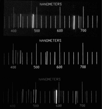 Figure 1.3. Gas emission spectra for hydrogen, mercury, and helium.