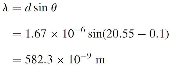 To begin, determine the range of wavelengths possible for each line based on the accuracy with which the angle can be determined. Examining the figure, it is evident that the angle can be read to an estimated accuracy of 0.1 degree. For the line at 20.55 degrees, the actual angle could be +0.1 degree and so could be anywhere in the range 20.45 to 20.65 degrees. Knowing that the line spacing is d =1/600,000 m21 or 1.67 × 10-6 m, we can substitute each angle into a rearranged to solve for wavelength. To determine the lower range of possible wavelengths for the unknown line: