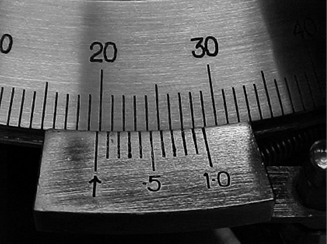 be read accurately using a vernier scale, shown in Figure 1.4. In the example illustrated in the figure, the angle is determined to be 19.8 degrees; 19 is read from the arrow and the eighth is read from the line on the vernier scale that matches that on the scale onto which the grating is mounted. Knowing that the grating is ruled at 600 lines/nm, determine the gas in the discharge tube.
