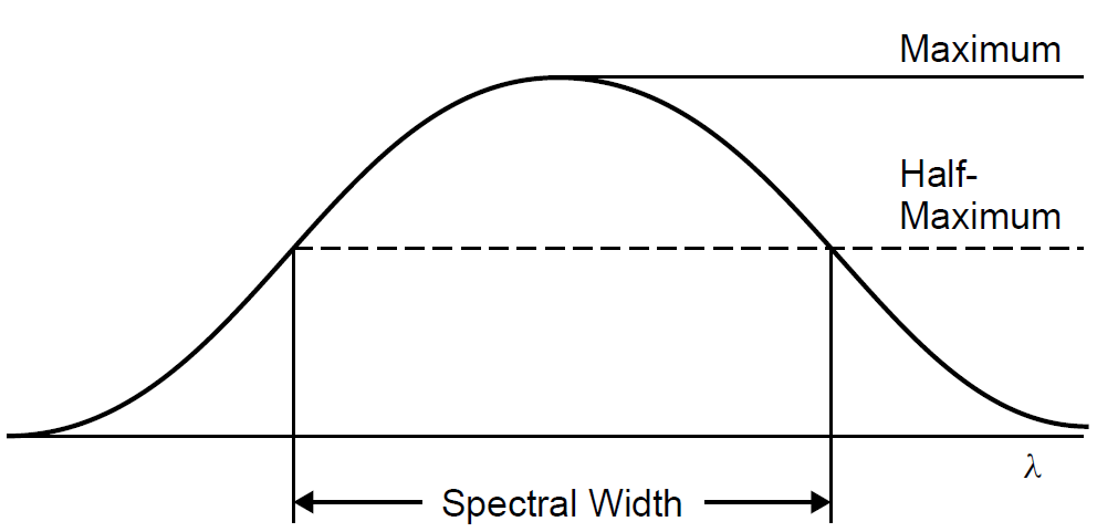 as located at the half-maximum intensity point of the output. This is called the full width half maximum (FWHM) of the output and is the standard way of measuring spectral width, as depicted in Figure 1.5.