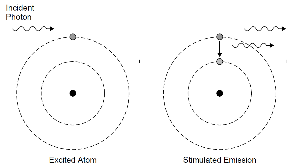 If a photon of light at an energy of, say, E is fired into a cell containing atoms at ground state, it is possible that it will be absorbed and, in the process, pump the atom to a higher-energy state. The energy of the incident photon must be at least equal to that of the upward transition. This, of course, is absorption. If the atom is already in a high energy state, though (the upper-energy level we refer to continually), and a photon of the correct wavelength comes along (the wavelength corresponding to a transition from the upper state to a lower state in the atom), it can stimulate the excited atom to emit a photon of exactly the same wavelength and phase as the incident photon, leaving two photons exiting this process going in exactly the same direction. The fact that these two photons are identical makes the emitted radiation coherent and monochromatic, two key properties of laser light. The fact that they are emitted in the same direction will play a role along with a well-aligned cavity in making the light collimated, the third key property of laser light. In essence, the original photon is amplified by this process, which is called stimulated emission. The word laser is an acronym for “light amplification by stimulated emission of radiation”; stimulated emission is the key process here. The process is diagrammed in Figure 1.1.