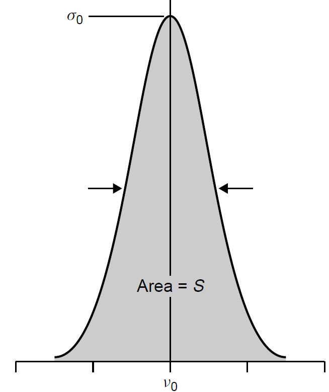 where N2 - N1 is the population difference (ΔN) and σ0 is the cross section of the stimulated emission process. This states, not surprisingly, that gain is proportional to the population inversion as well as the cross section. Larger cross sections present more opportunity for stimulated emissions to occur and hence render larger gains. Cross section, as defined earlier, can be expressed mathematically as the product of the transition strength (or oscillator strength), S, and the line shape function of gain, g(v), which gives the normalized gain of the stimulated emission process at any given frequency. Graphically, transition strength is seen as the area under the curve, which defines the cross section as a function of frequency, as depicted in Figure 1.1.