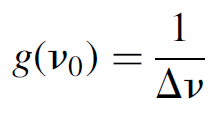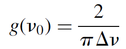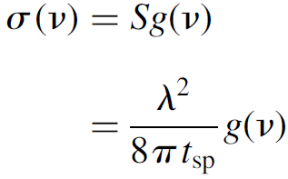 where g(v) is the line shape of the gain function and tsp is the spontaneous lifetime of the species. So the cross section of the species is related to the spontaneous lifetime, an observable quantity in the laboratory. It may also be found in tables of physical constants for many species. This leaves the final term, called the line shape function for gain, to be defined.