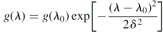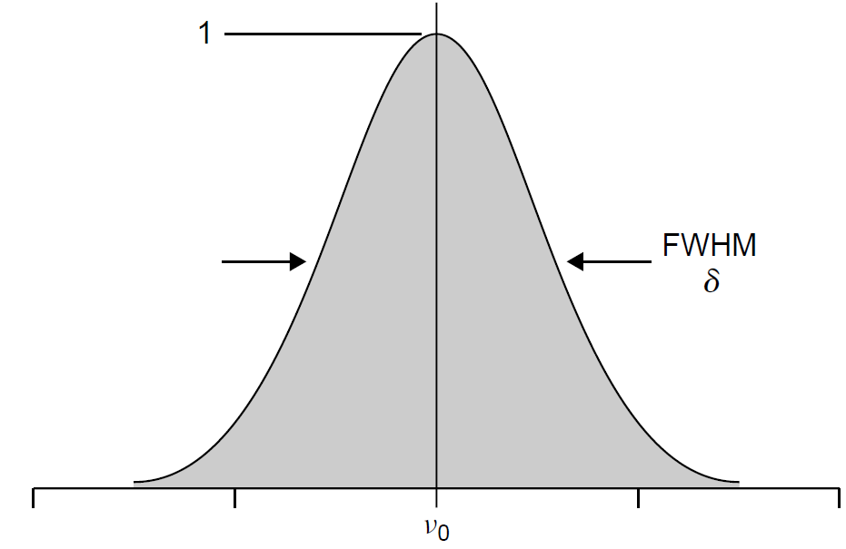where δ is the FWHM width of the gain spectrum (in nm), which models, mathematically, the Gaussian shape of a typical gain curve. For many purposes it is sufficient to use a gain value at the maxima on the curve, at the center wavelength or frequency (denoted v0). A reasonable approximation for the gain curve is