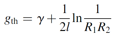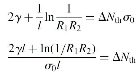 We may simply combine this (multiplied by 2 to render an expression for round-trip loss in the laser) with equation (1.1) (by equating gth to g) to yield an answer for threshold in terms of the population inversion required to allow a laser to oscillate as follows: