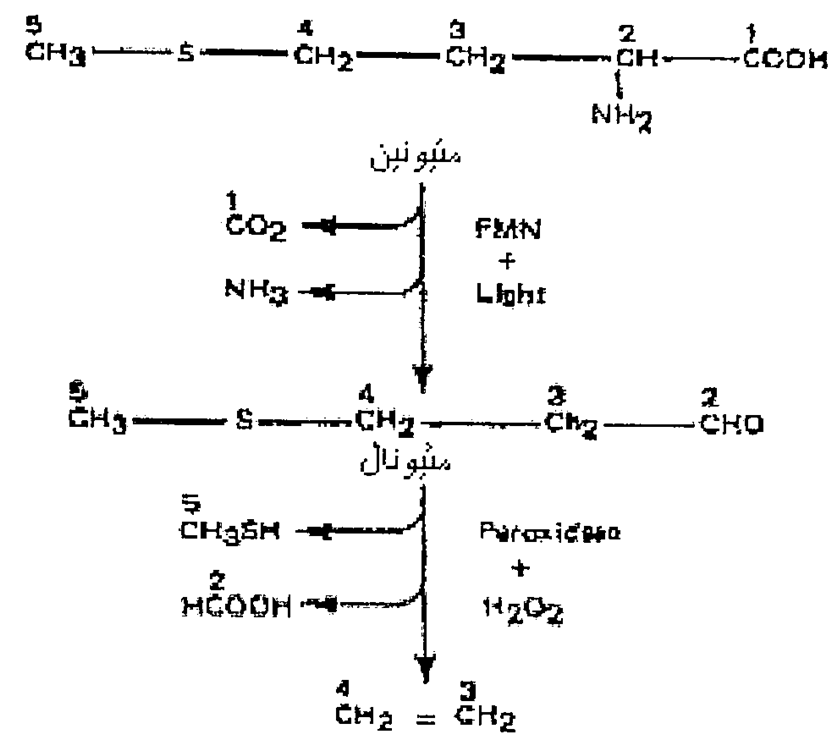 يعتبر الحمض الأميني الميثونين Methionine الذي يحتوي في تركيبه على الكبريت المادة الأولية Primary substrates لتكوين الاثيلين Ethylene وتبين فيما بعد ان معاملة الفاكهة والاجزاء الخضراء للنبات بالميثونين تزيد من تكوين الاثيلين بشكل كبير، كما بينت الدراسات وباستخدام الميثونين المشع أن الكربون الثالث والرابع هما اللذان يعطيان الاثيلين فيما بعد أما الصيغة الكيميائية للميثونين وآلية بناء الاثلين فهي موضحة في الشكل1.
