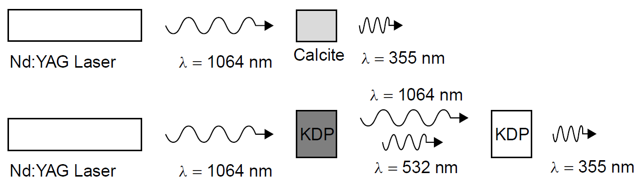 to a second-order coefficient, much less efficiency is expected for third-harmonic generation. Calcite, for example, can be used as a third-harmonic generator with efficiencies of less than 10-5. Alternatively, series nonlinear crystals can be used to generate third-harmonic light: the first crystal producing second-harmonic light at 532 nm and the second crystal mixing this light with the original 1064-nm fundamental wavelength, the second crystal often being type I phase-matched. Both methods are outlined in Figure 1.1.