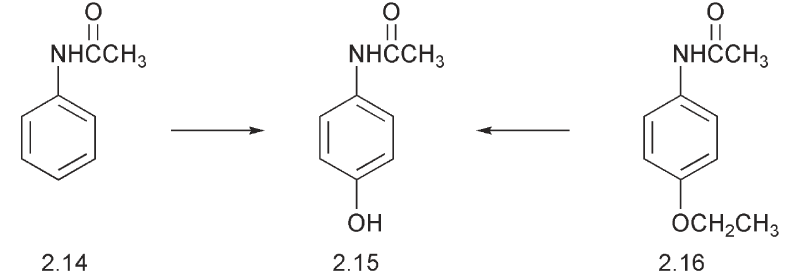 One of the simplest examples of a pro-drug is that of methenamine (hexamethylenetetramine) 2.38, which was used as a urinary tract antiseptic because it was broken down in the acidic medium of the urine to release formaldehyde. Another example was the analgesic phenacetin 2.16 in which the ethoxy group was hydroxylated to form a hemi-acetal, which then released paracetamol 2.15.