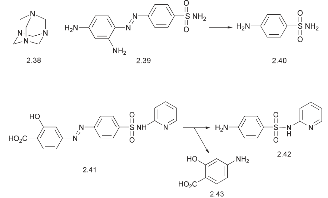 However phenacetin is no longer available because another of its metabolites has turned out to be toxic. The discovery of the sulfonamide anti-bacterial agents arose from the conversion of the dyestuff prontosil red 2.39 into sulfanilamide 2.40. Another sulfa drug to build on this is sulfasalazine 2.41, which was developed in the 1940s to treat ulcerative colitis. The pro-drug was cleaved by amidases in the colon to release sulfapyridine 2.42 and 5- aminosalicylic acid 2.43. It enabled a useful concentration of sulfapyridine to be established at the site of action.