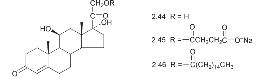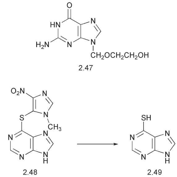Hydrocortisone 2.44 is used to alleviate inflammation at various sites in the body. The sodium succinate C-21 ester 2.45 provides a watersoluble pro-drug while the 21-palmitate 2.46 is a lipid-soluble pro-drug enabling it to reach different sites of activity. Another example is the antiviral agent acyclovir 2.47, which is transported into a virus before it is phosphorylated to give the active species. The triphosphate of acyclovir would not cross the viral cell wall. Azathioprine 2.48 is a pro-drug for 6- mercaptopurine 2.49, which is used as an immunosuppressant.